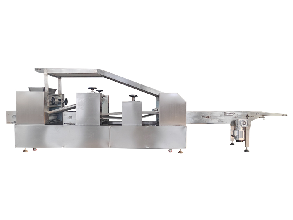 法餅成型機(jī)為臥式成型機(jī),通過(guò)傳送機(jī)構(gòu)將各道軋輥線速度比合理分配,實(shí)現(xiàn)從投料到制皮成型自動(dòng)化生產(chǎn)。